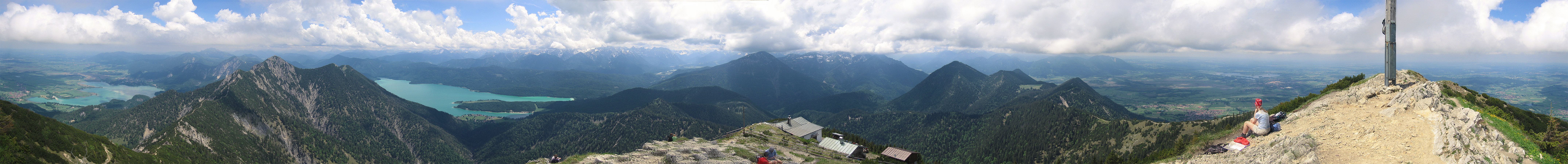 Panoramabild von Osten (Kochelsee, Benediktenwand, Herzogstand mit Grad, Martingskopf, Walchensee) über Süden (Karwendelgebirge, Wettersteingebirge) über Westen (Estergebirge ) nach Norden (Murnau, Staffelsee, Spazl, Gipfelkreuz, Starnbergersee)
