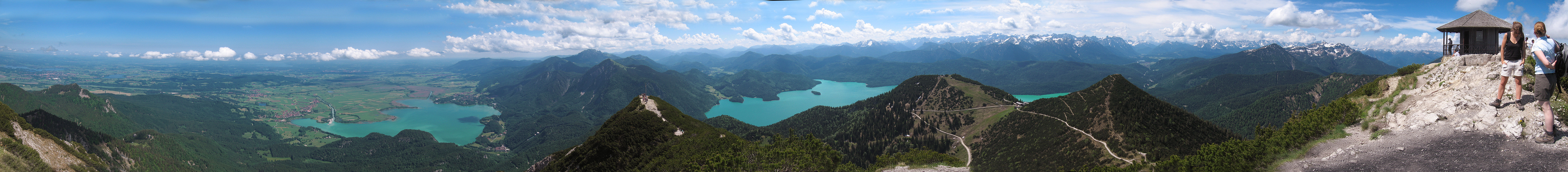 Panoramabild von Norden (Murnau, Staffelsee, Riegsee, Starnbergersee, Kochelsee im Vordergrund) über Osten (Benediktenwand, Jachenau, Walchensee) über Süden (im Hindergrund Karwendelgebirge, im Vordergrund Martinskopf ) nach Süden (Wettersteingebirge mit Zugspitze, Estergebirge, Allgäu) |