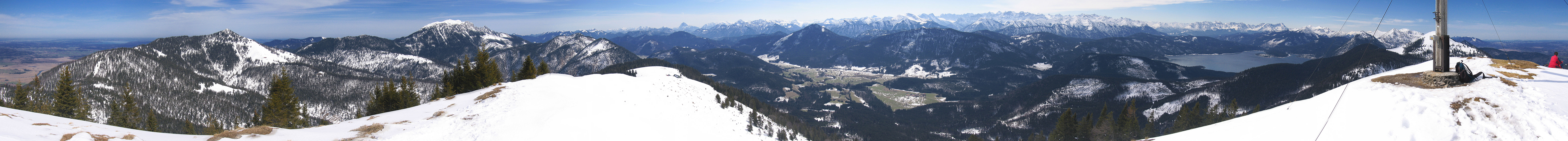 Panoramabild von Norde(Heimgarten, Herzogstand, Walchensee, Jochberg, Benediktenwand) über Osten (Schöttelkarspitze, Soiernspitze, Gumpenkarspitze) über Süden (westliches Karwendelgebirge, Mittenwald, Arnspitze, ) nach Westen (Wettersteingebirge)