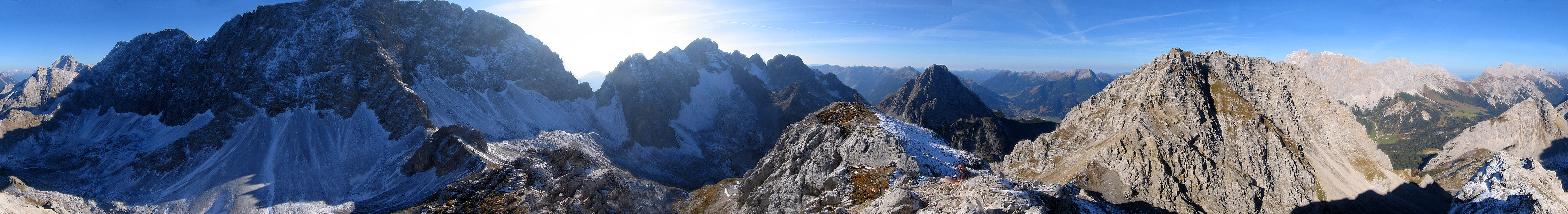 Blick vom Hinterer Tajakopf von Osten (Hohe Munde, Mieminger Kette) über Süden (Grünstein) über Osten (Sonnenspitze, Daniel, Vorderer Tajakopf) nach Norden (Zugspitze, Wettersteingebirge)