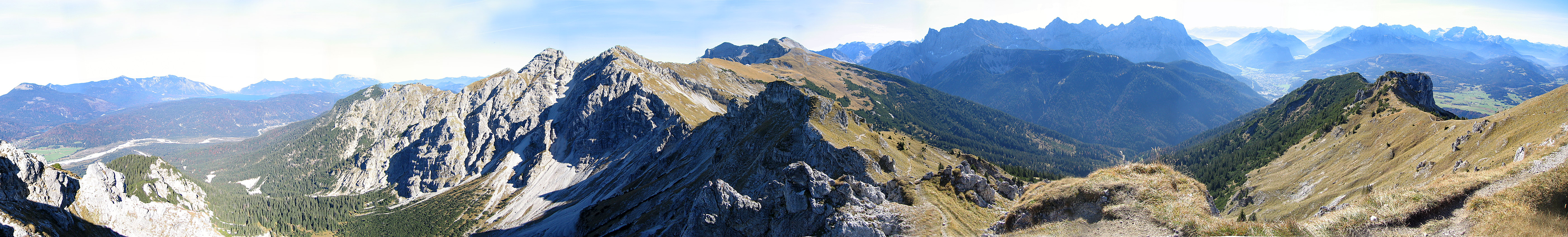 Panoramabild von Norden (Heimgarten, Herzogstand, Walchensee, Jochberg, Benediktenwand) über Osten (Schöttelkarspitze, Soiernspitze, Gumpenkarspitze) über Süden (westliches Karwendelgebirge, Mittenwald, Arnspitze, ) nach Westen (Wettersteingebirge)